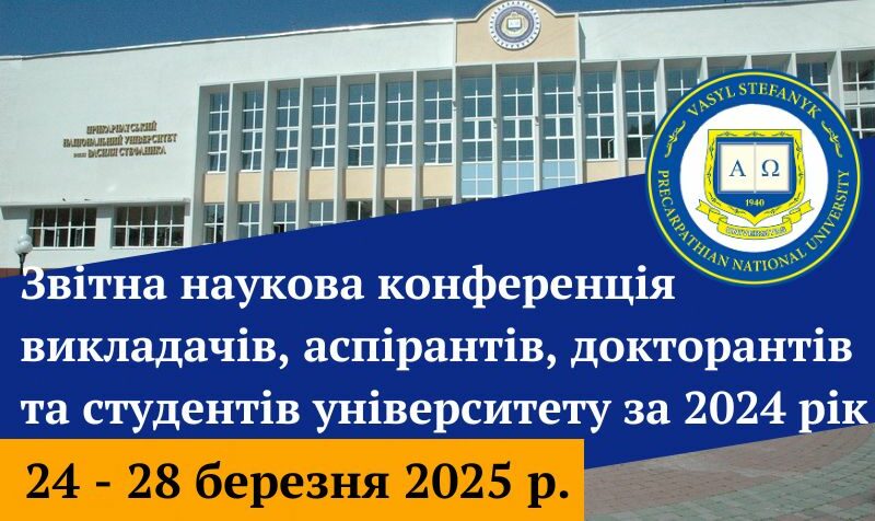 Шановні викладачі, докторанти, аспіранти! Ректорат Прикарпатського національного університету імені Василя Стефаника запрошує вас взяти участь у звітній науковій конференції університету за 2024 рік, яка відбудеться 24-28 березня 2025 року. Робота конференції: 24.03.2025 р. – пленарне засідання; 25.03.2025 р. – засідання секцій у пленарній формі та засідання підсекцій за участю викладачів, докторантів, аспірантів на факультетах, інститутах та у наукових підрозділах; 26.03.-27.03.2025 р. – засідання підсекцій за участю студентів; 28.03.2025 р. – підсумкове засідання керівників секцій. Всі засідання проходитимуть в очному форматі. Пленарне засідання відбудеться в 23 ауд. в 14:00.