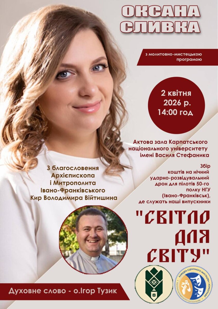 Запрошуємо стати частиною молитовно-мистецької програми «Світло для світу» за участю співачки Оксани Сливки (Оксани Карпаш -кандидатки мистецтвознавства, доцентки кафедри сценічного мистецтва і хореографії Навчально-наукового інституту мистецтв Карпатського національного університету імені Василя Стефаника) та