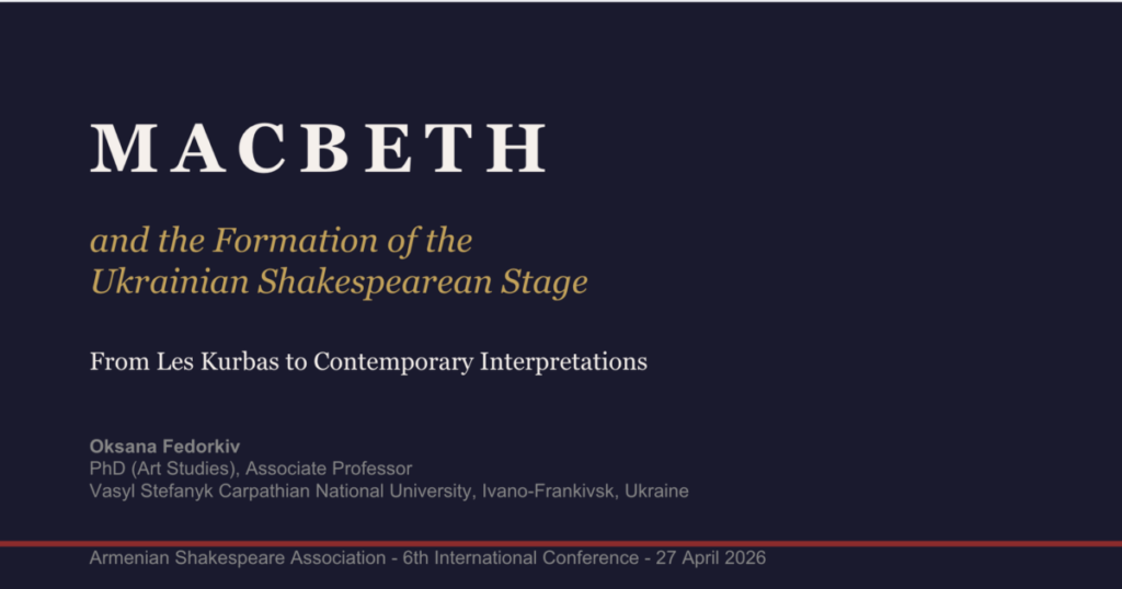 Доцентка кафедри сценічного мистецтва і хореографії Карпатського національного університету імені Василя Стефаника Оксана Федорків взяла участь у VI Міжнародній науковій конференції Armenian Shakespeare Association «Let’s Talk About Macbeth: Treachery for/of Power and where is ‘the Milk of Human Kindness?’», організованій за участі American University of Armenia та Yerevan State Chamber Theatre. Конференція проходила 27–28 квітня 2026 року в онлайн-форматі та об’єднала науковців, театрознавців і практиків театру з різних країн світу.
