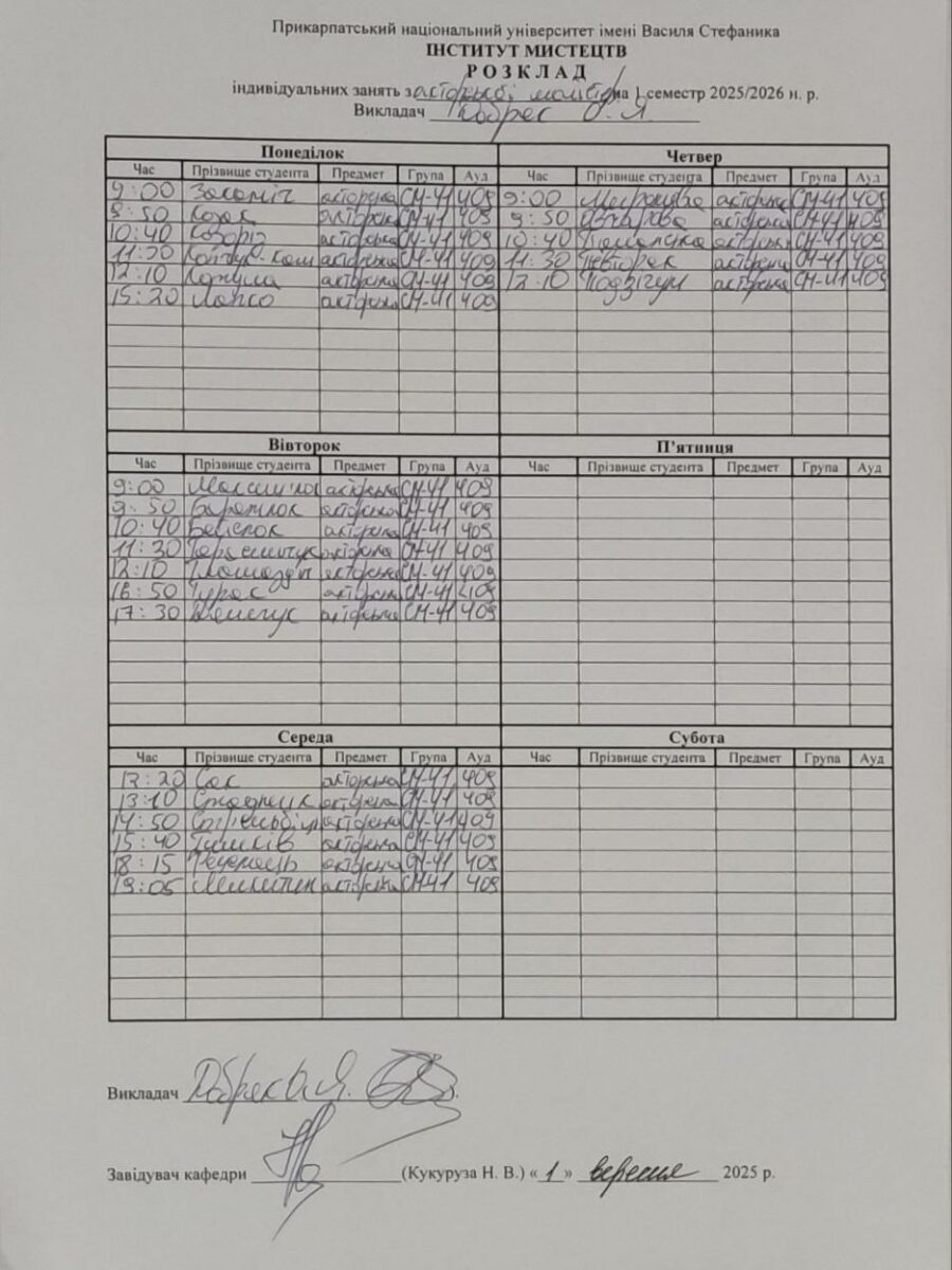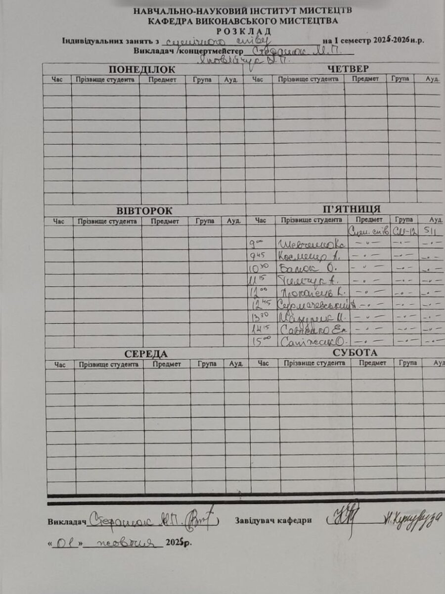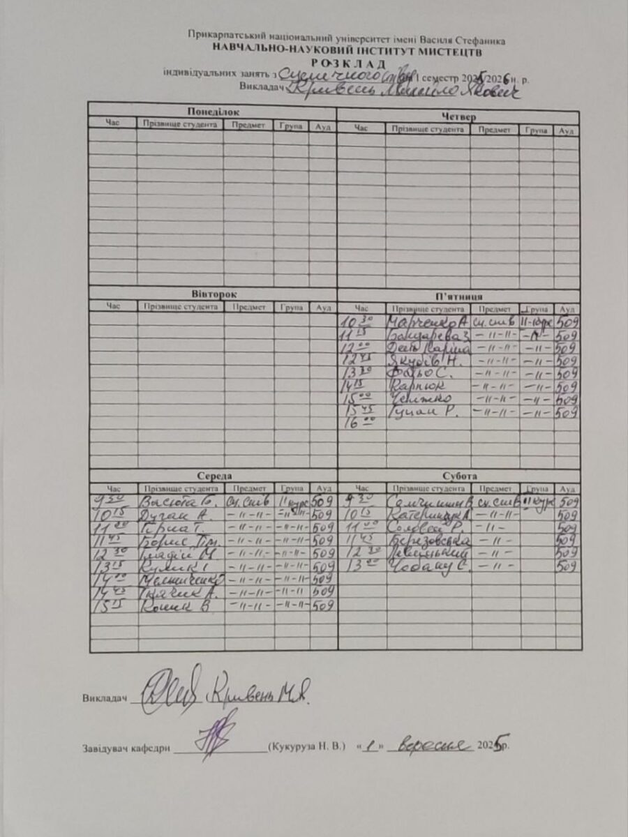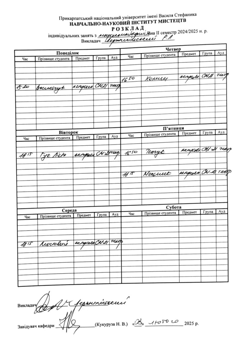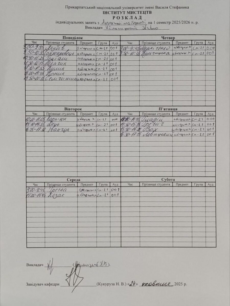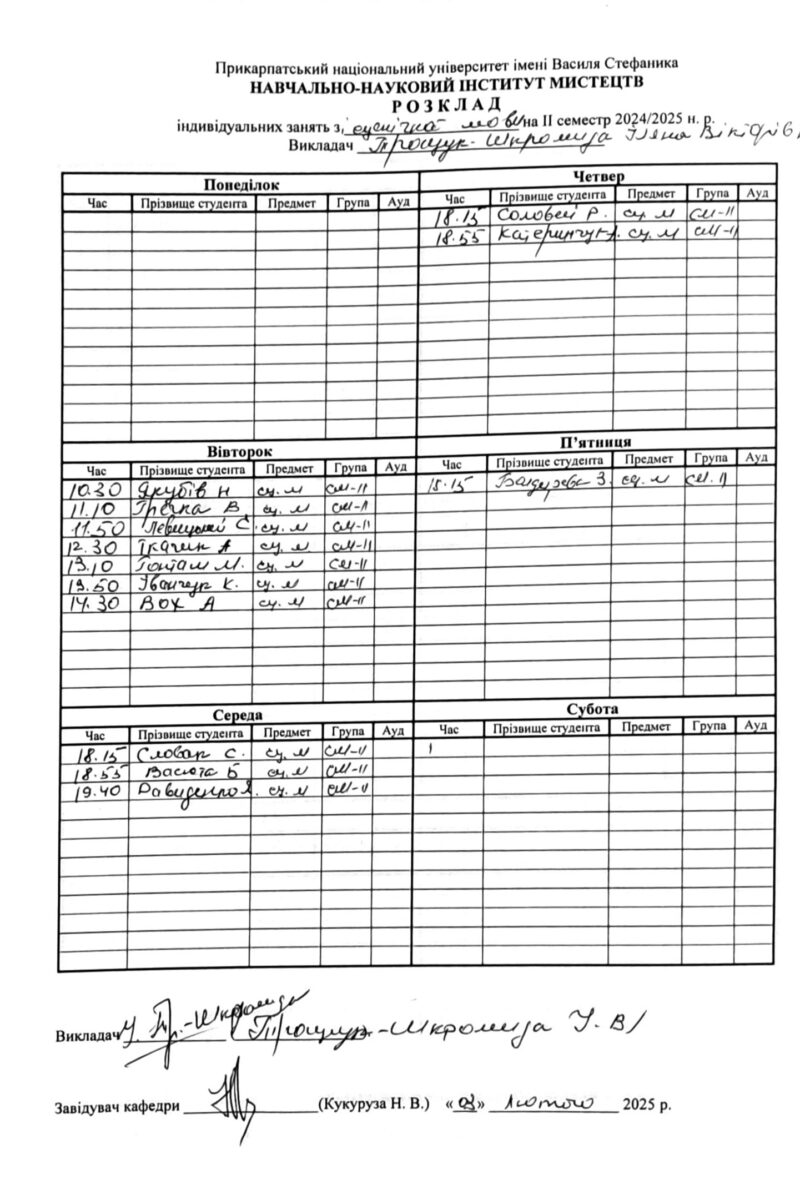 Розклади індивідуальних занять І семестр 2025-2026 навчального року ІІ семестр 2024-2025 навчального року І семестр 2024-2025 навчального року ІІ семестр 2023-2024 навчального року