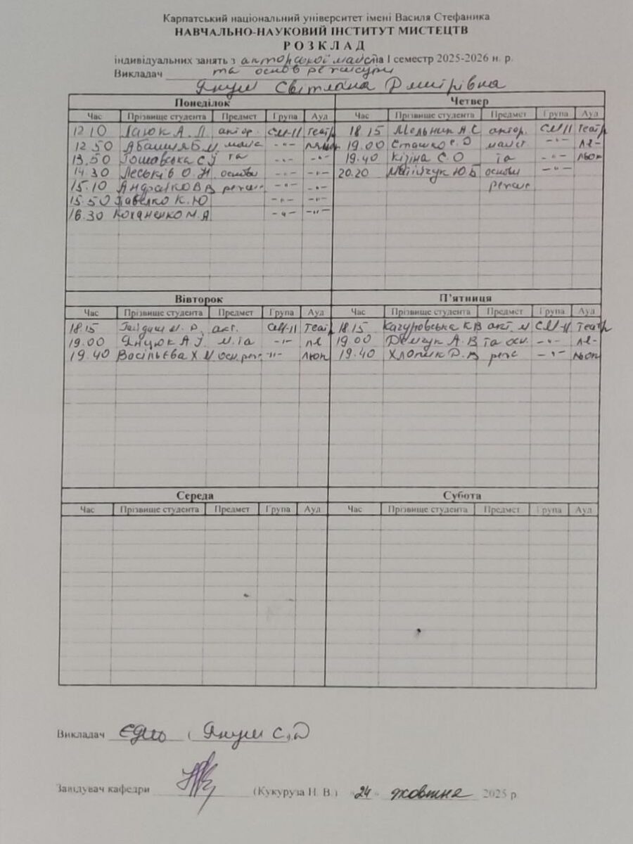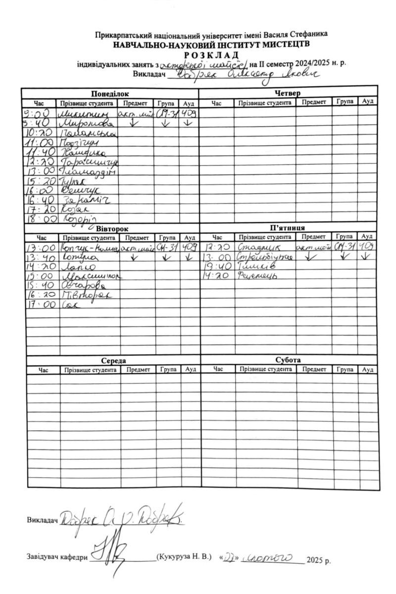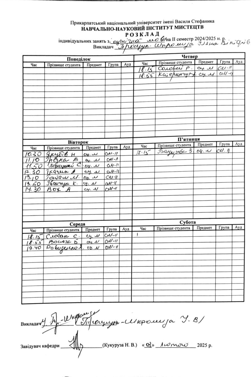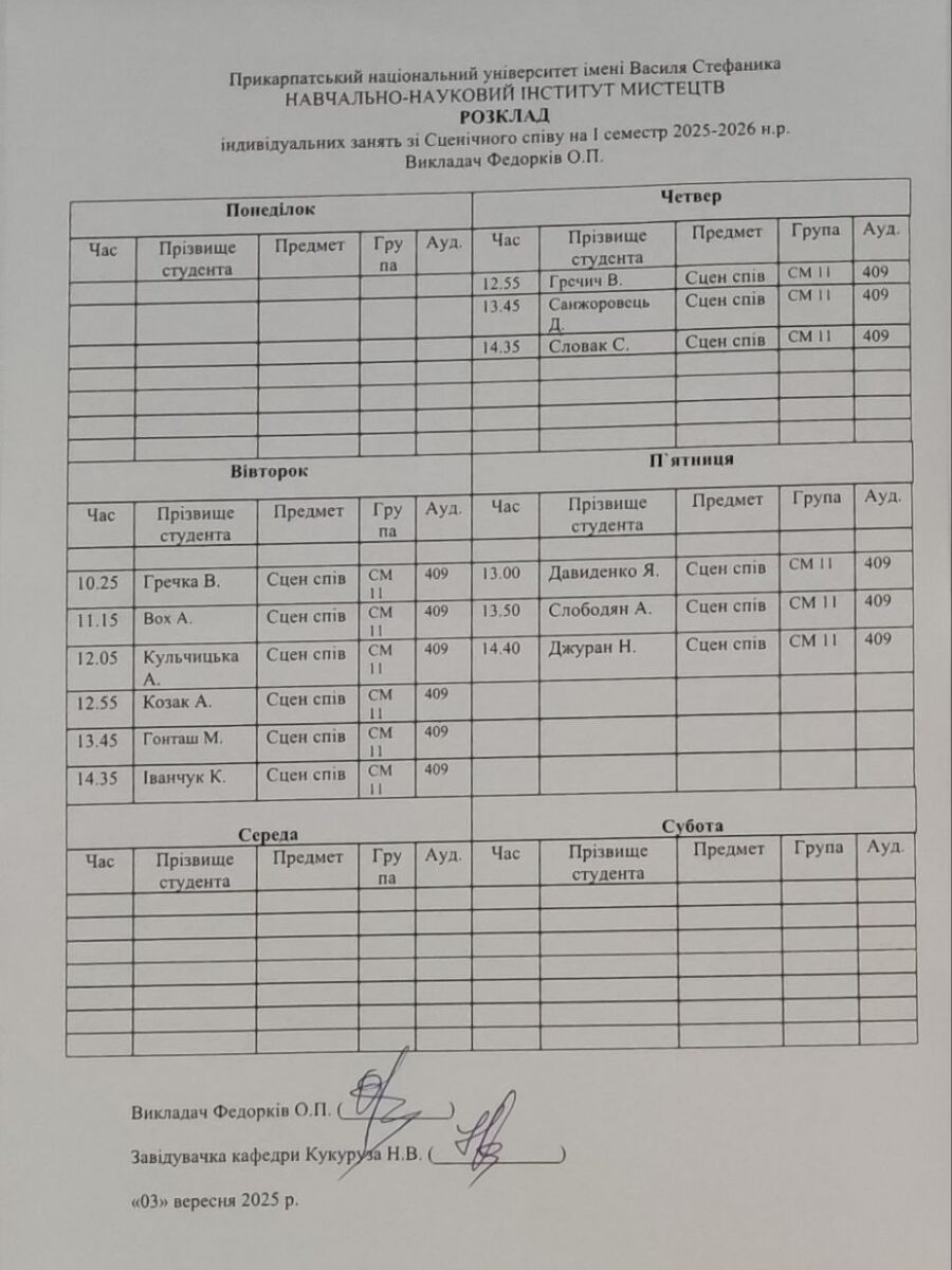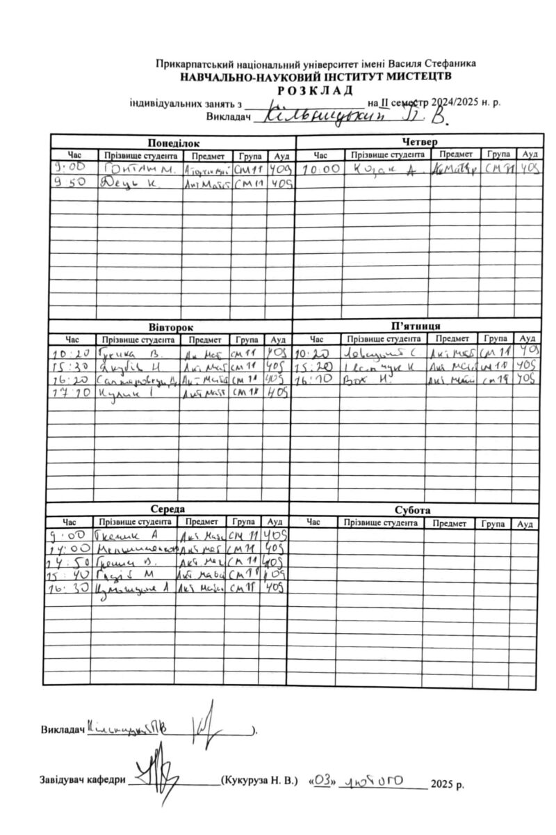 Розклади індивідуальних занять І семестр 2025-2026 навчального року ІІ семестр 2024-2025 навчального року І семестр 2024-2025 навчального року ІІ семестр 2023-2024 навчального року