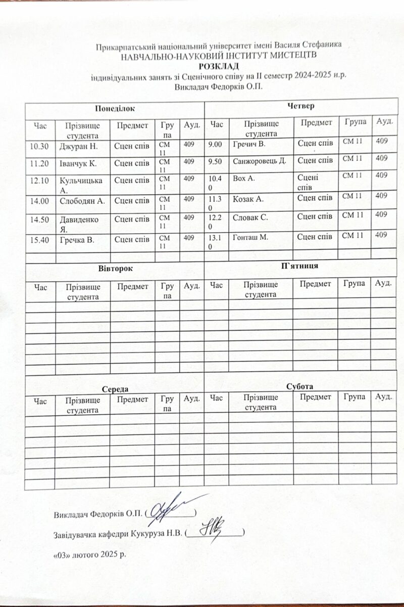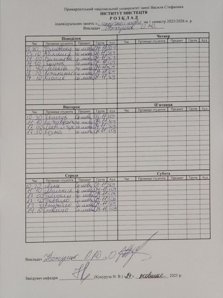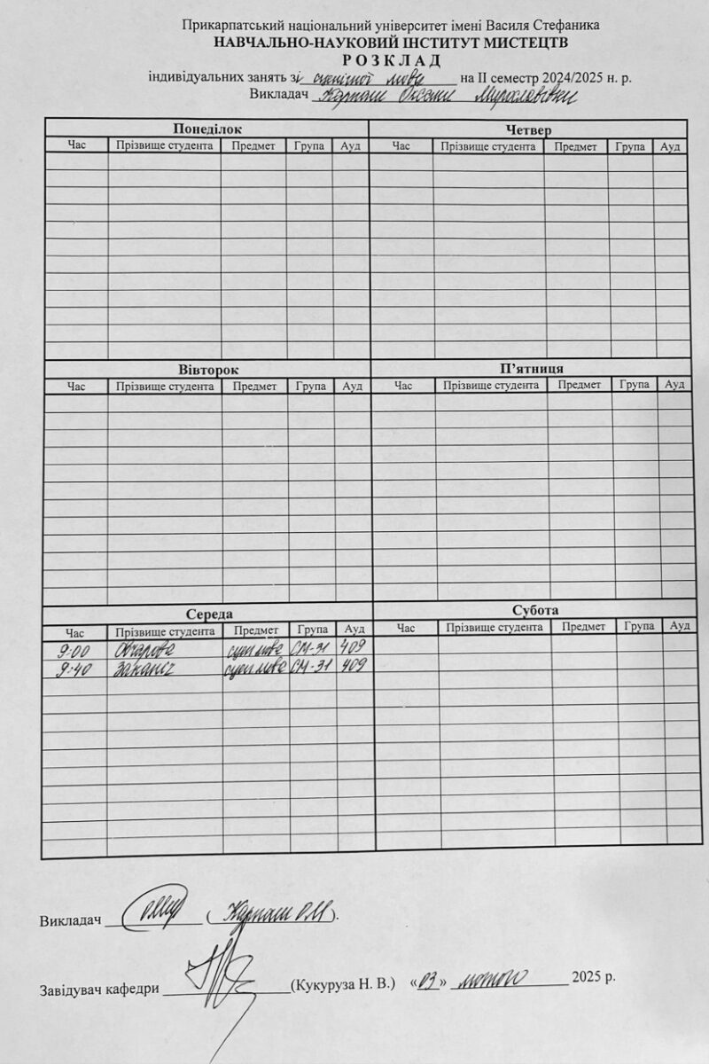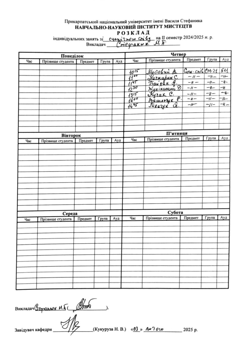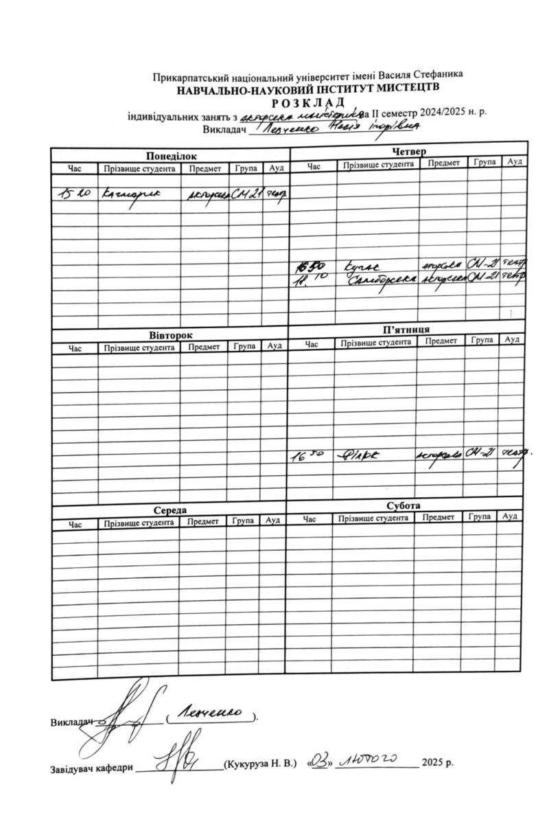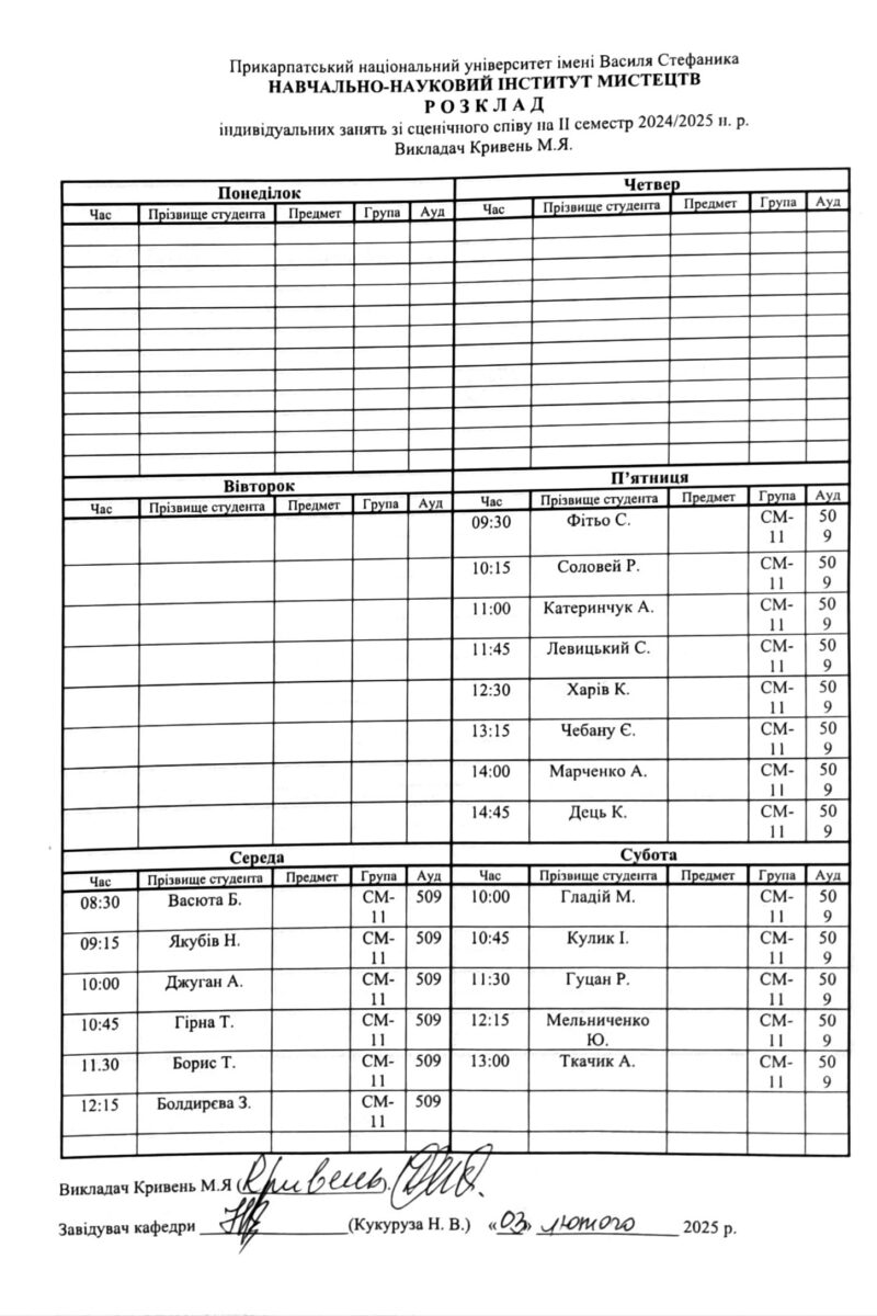 Розклади індивідуальних занять І семестр 2025-2026 навчального року ІІ семестр 2024-2025 навчального року І семестр 2024-2025 навчального року ІІ семестр 2023-2024 навчального року