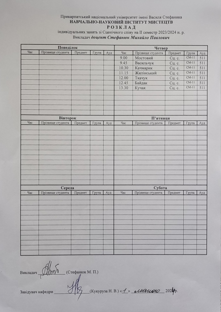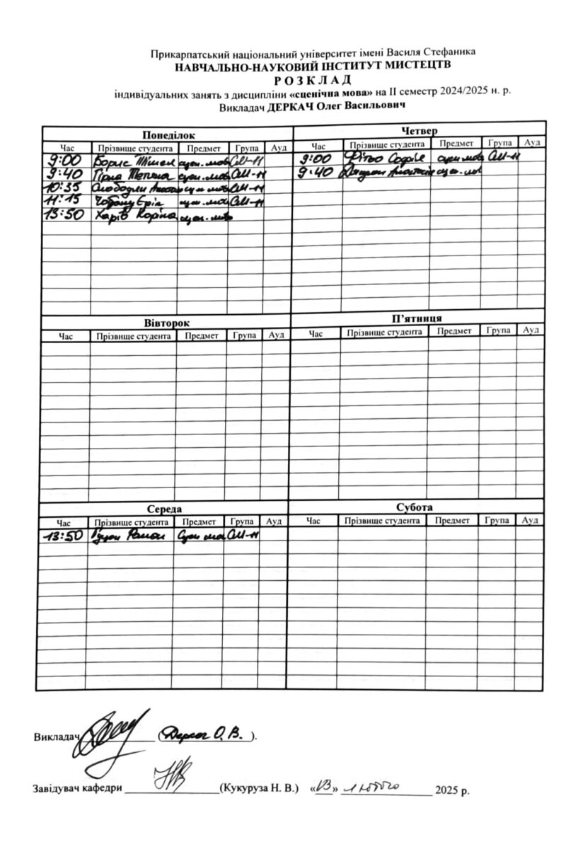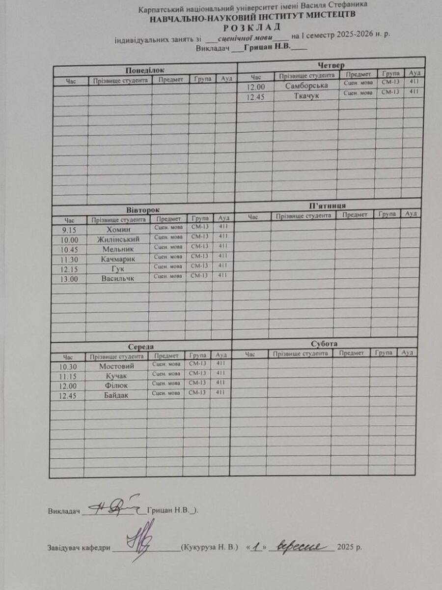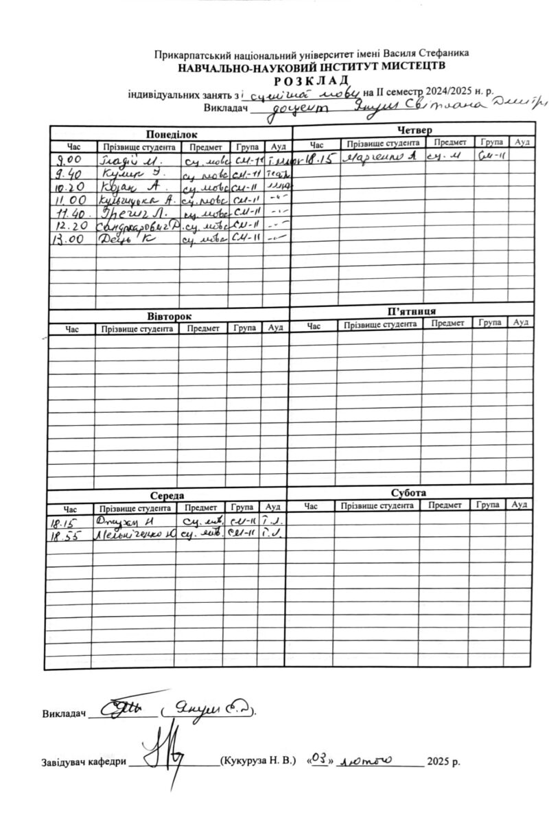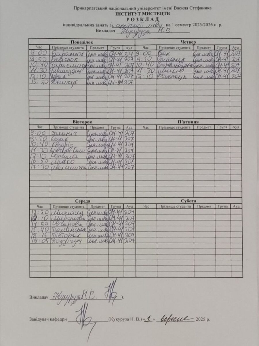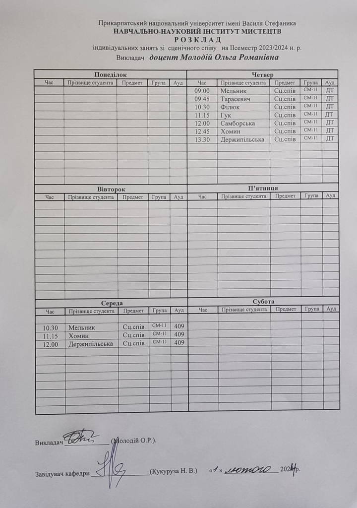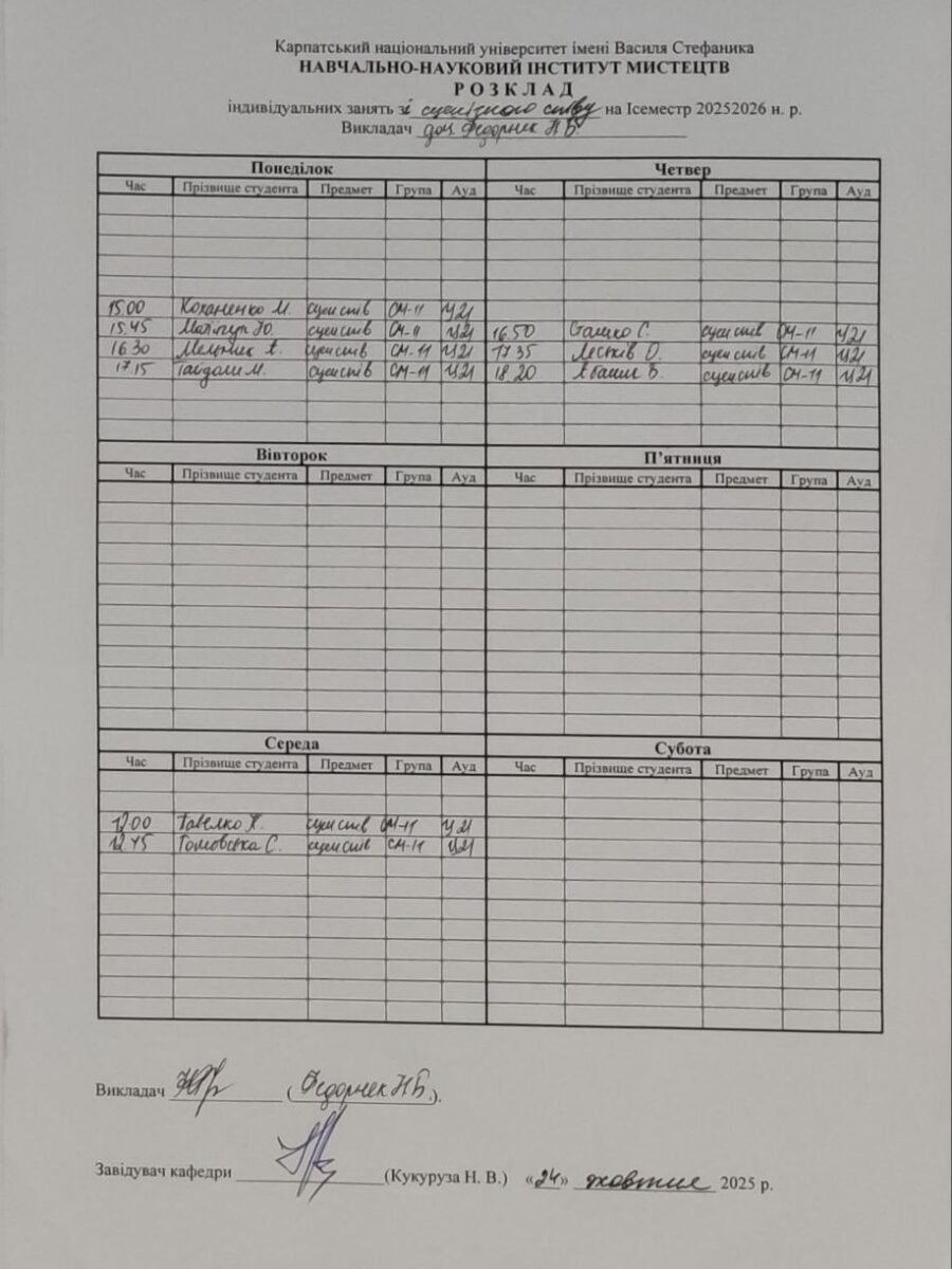 Розклади індивідуальних занять І семестр 2025-2026 навчального року ІІ семестр 2024-2025 навчального року І семестр 2024-2025 навчального року ІІ семестр 2023-2024 навчального року