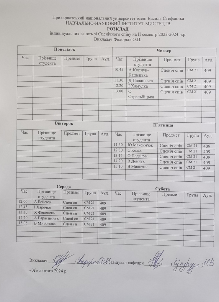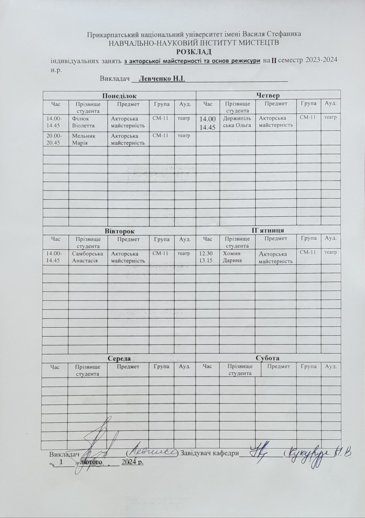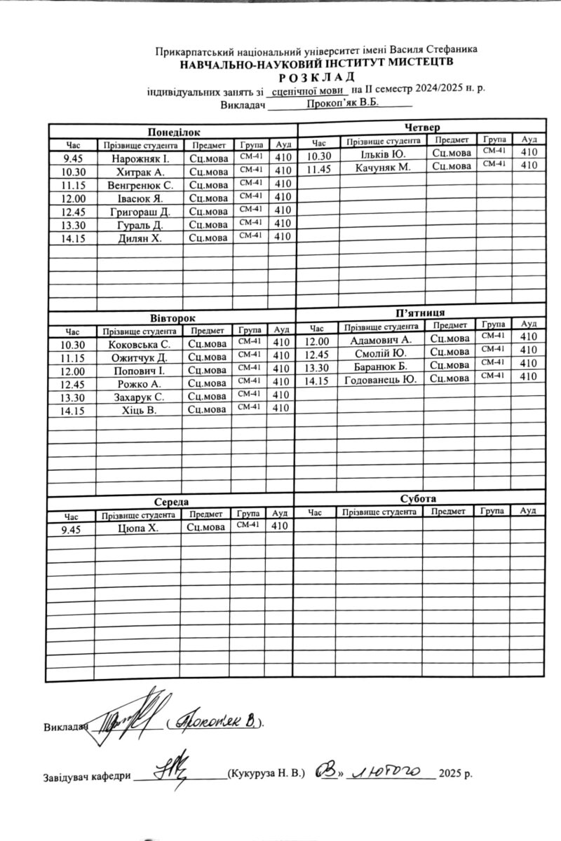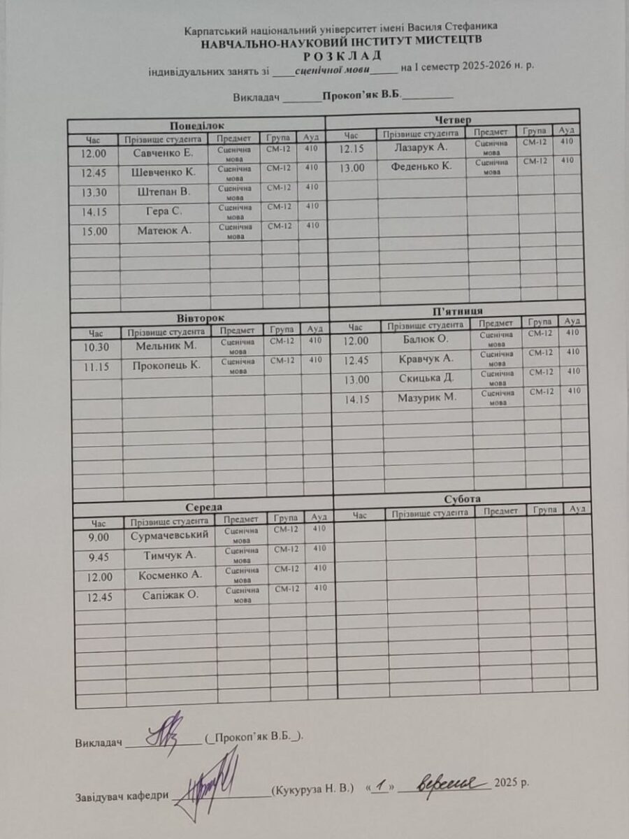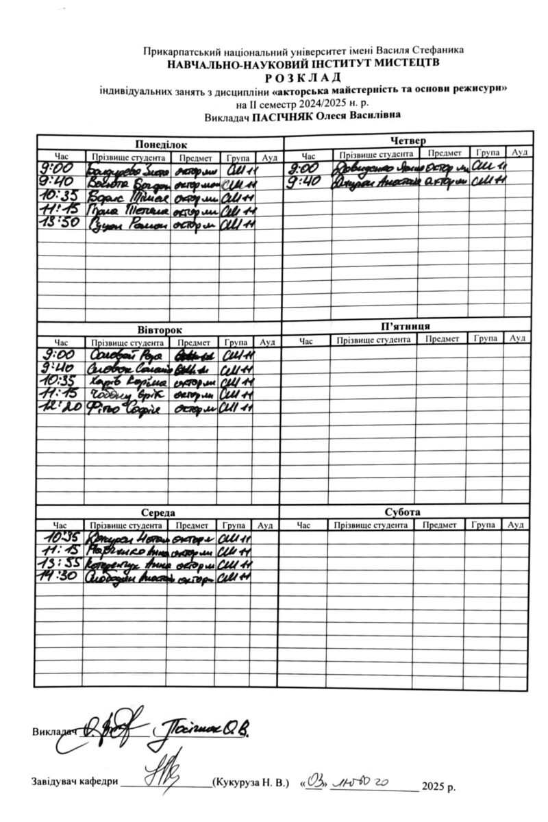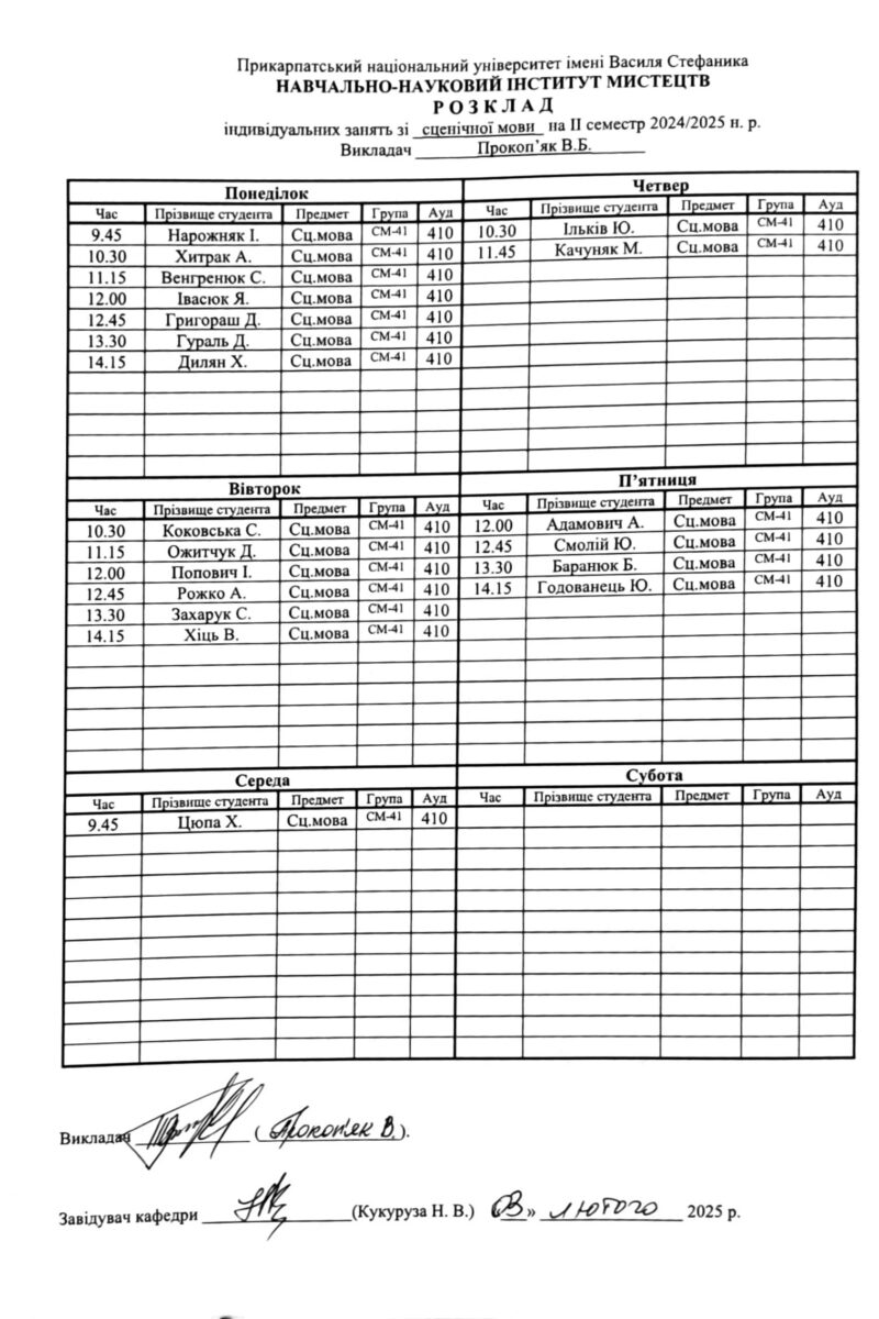 Розклади індивідуальних занять І семестр 2025-2026 навчального року ІІ семестр 2024-2025 навчального року І семестр 2024-2025 навчального року ІІ семестр 2023-2024 навчального року