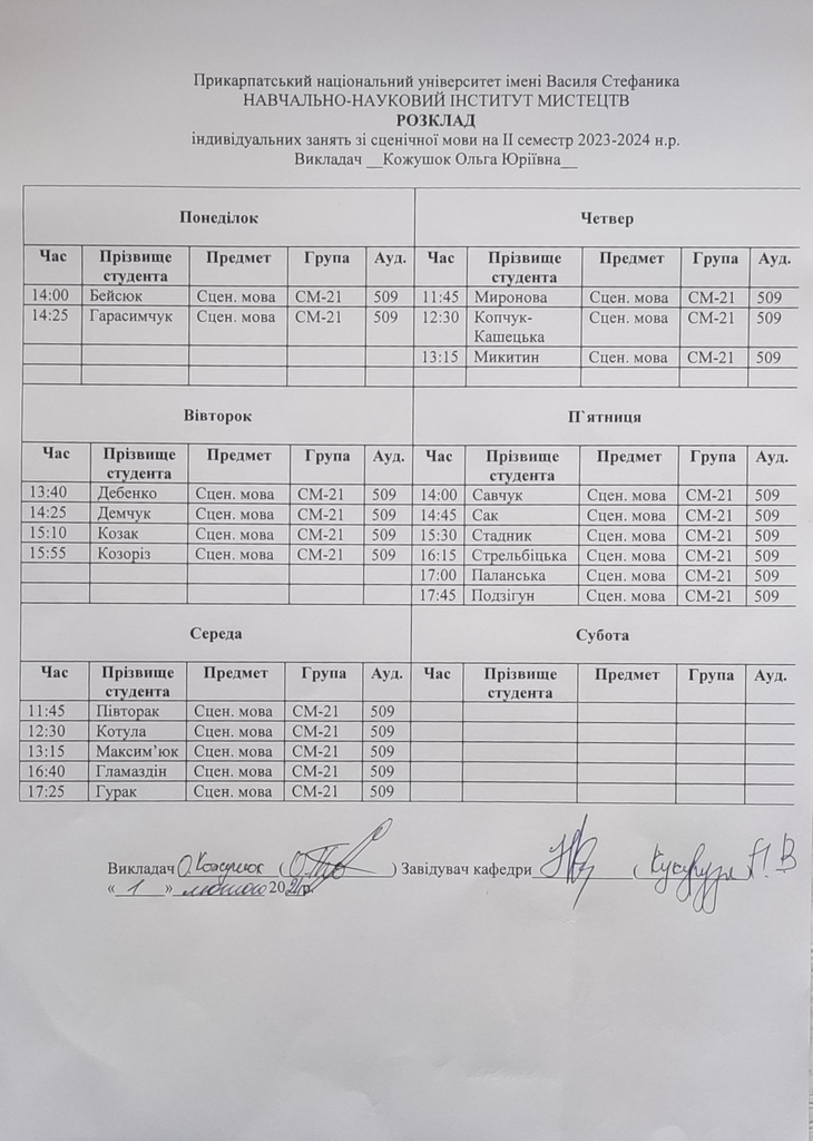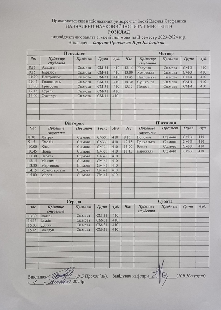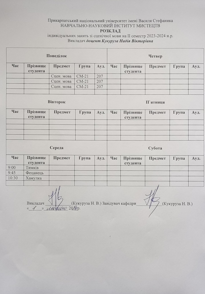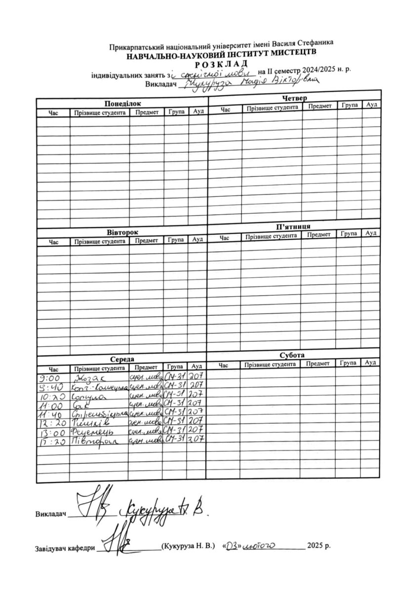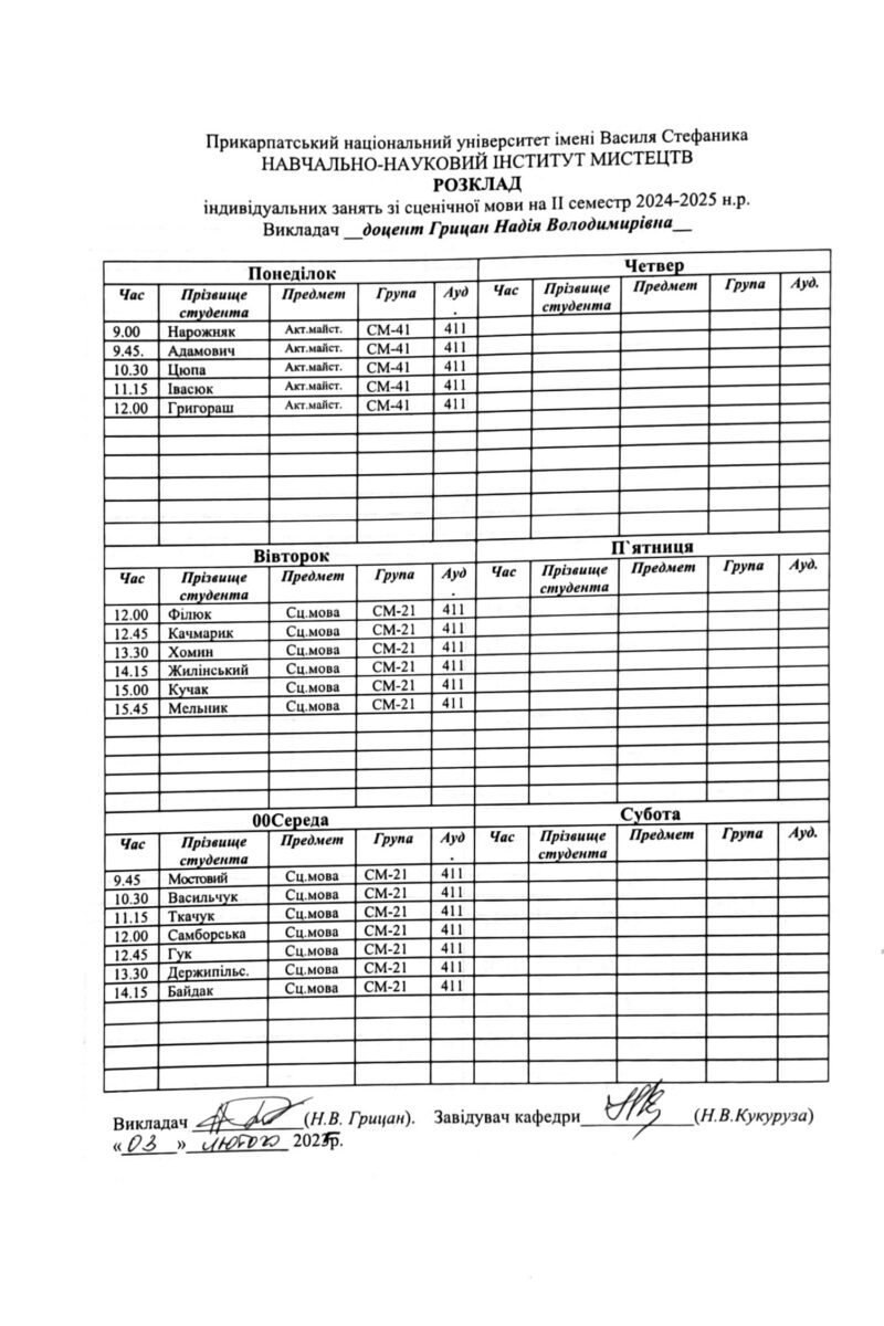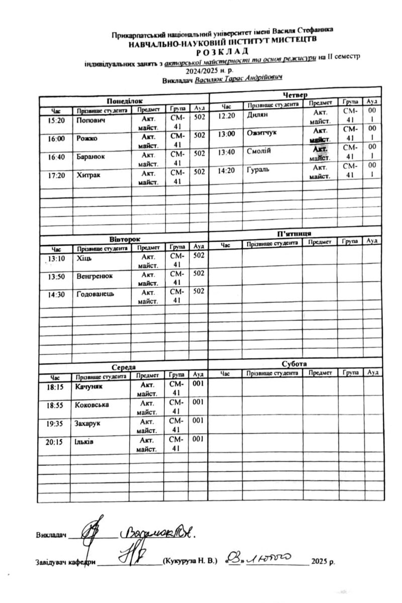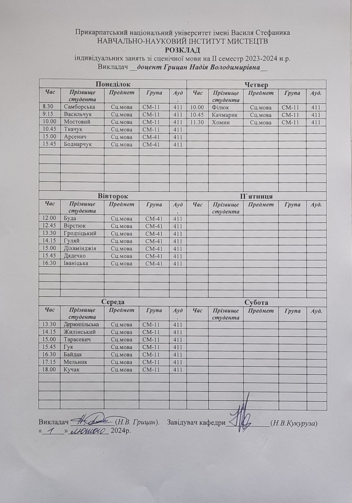 Розклади індивідуальних занять І семестр 2025-2026 навчального року ІІ семестр 2024-2025 навчального року І семестр 2024-2025 навчального року ІІ семестр 2023-2024 навчального року