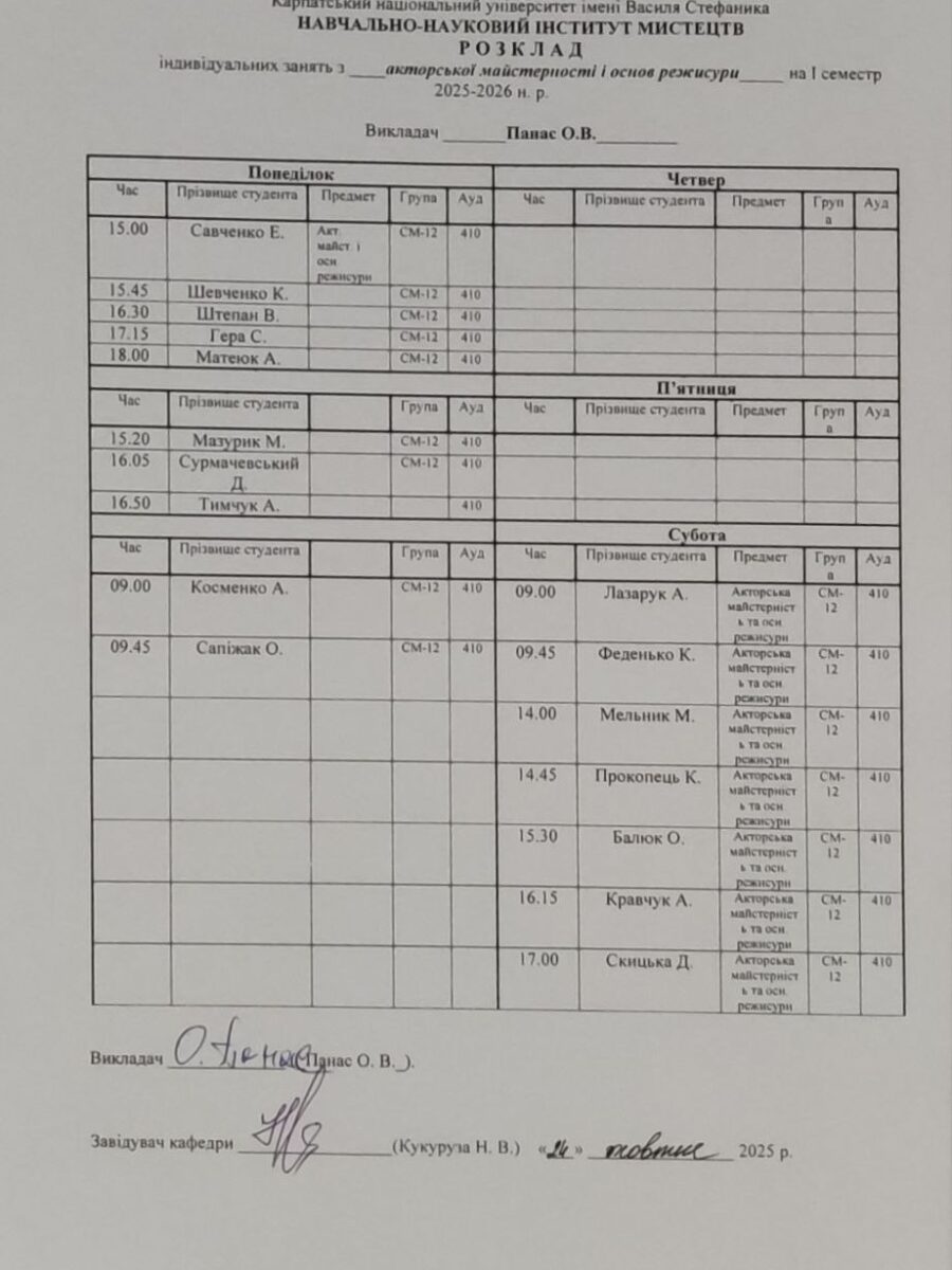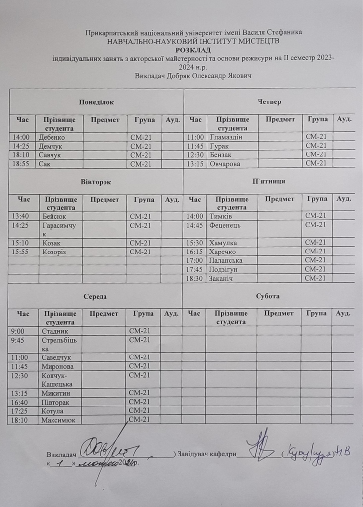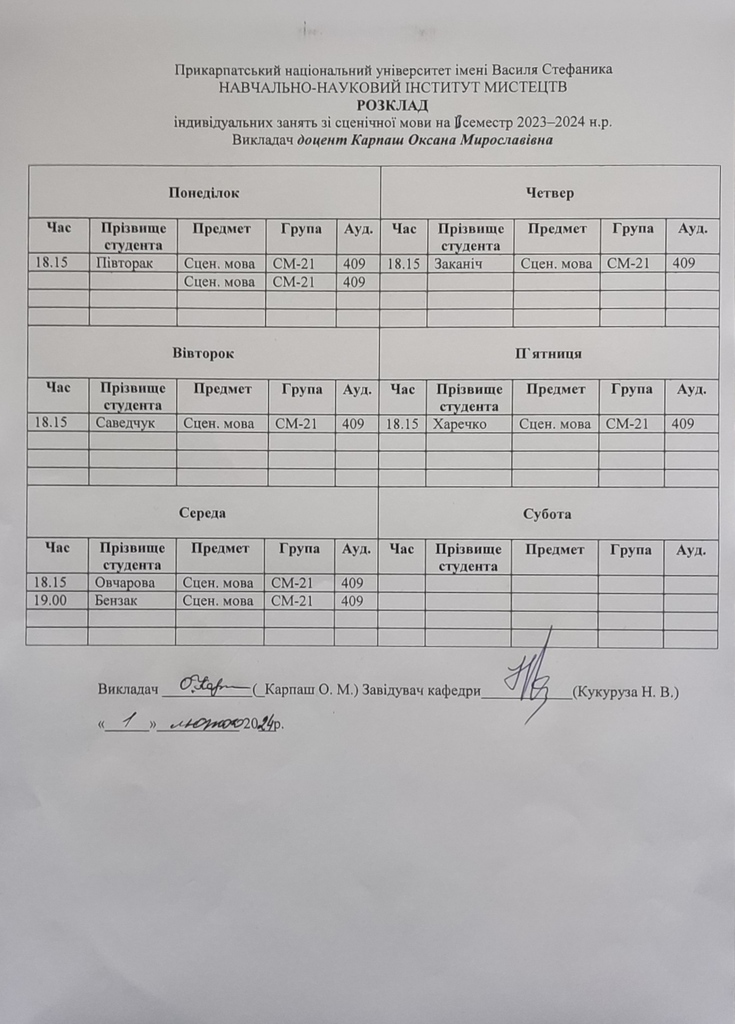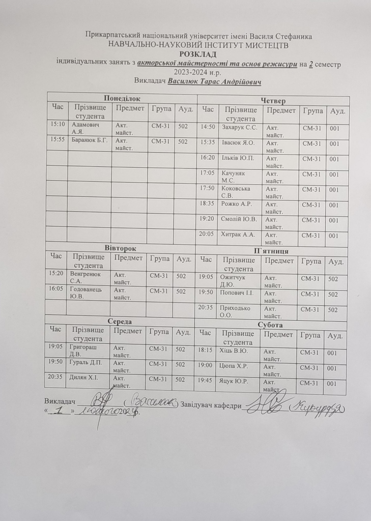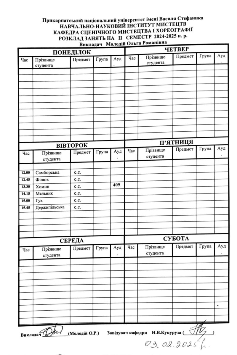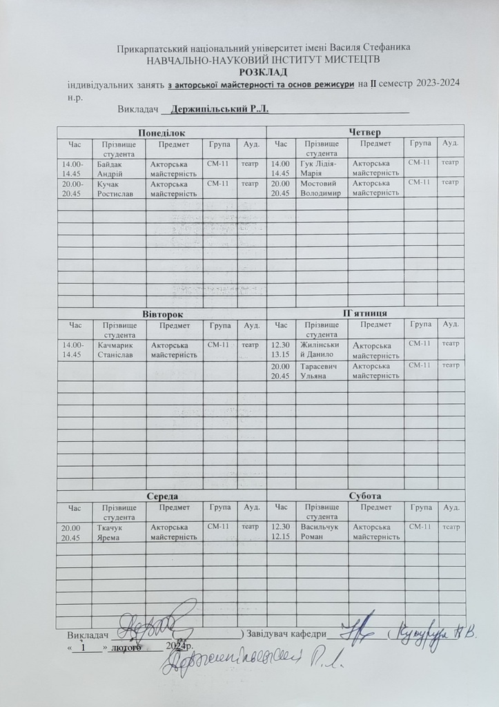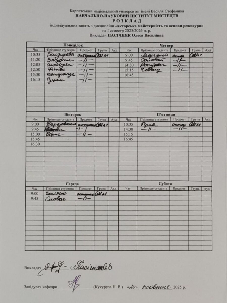 Розклади індивідуальних занять І семестр 2025-2026 навчального року ІІ семестр 2024-2025 навчального року І семестр 2024-2025 навчального року ІІ семестр 2023-2024 навчального року