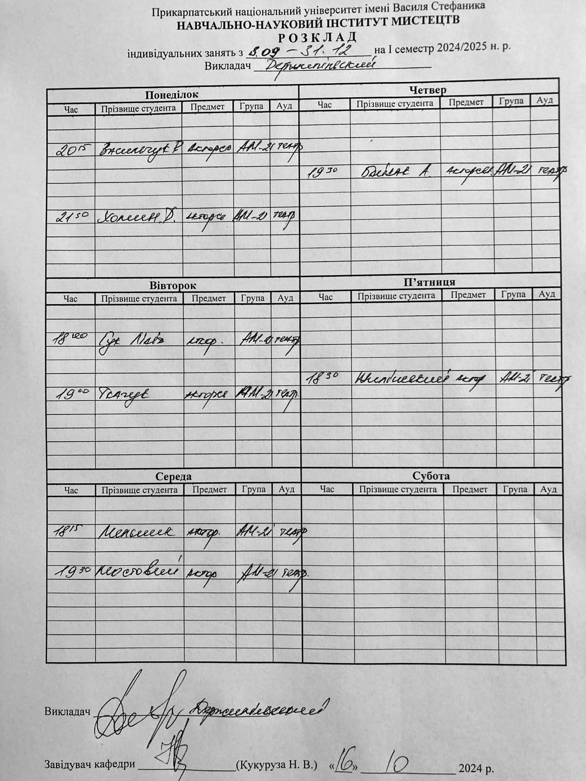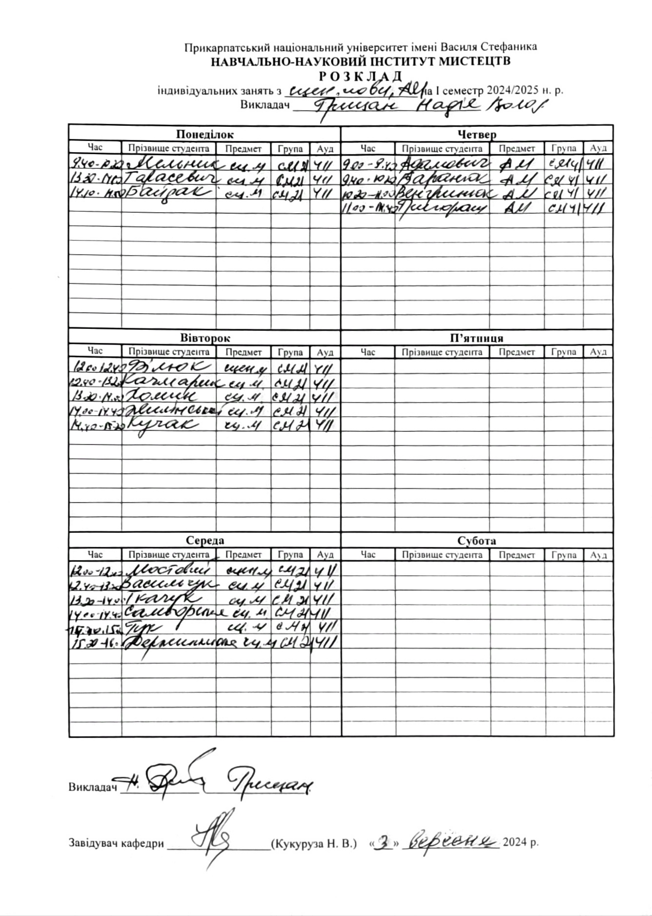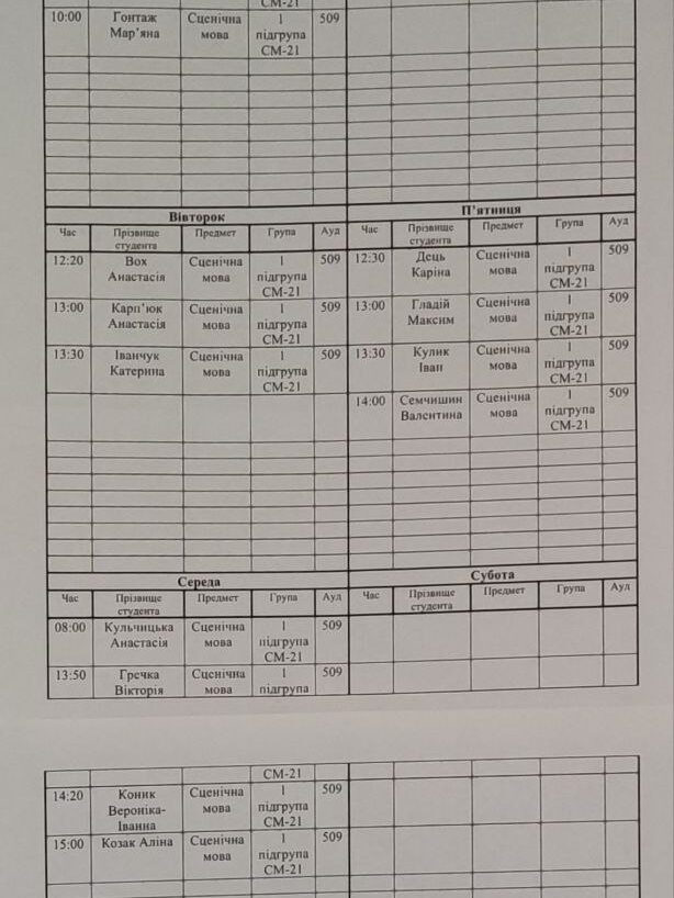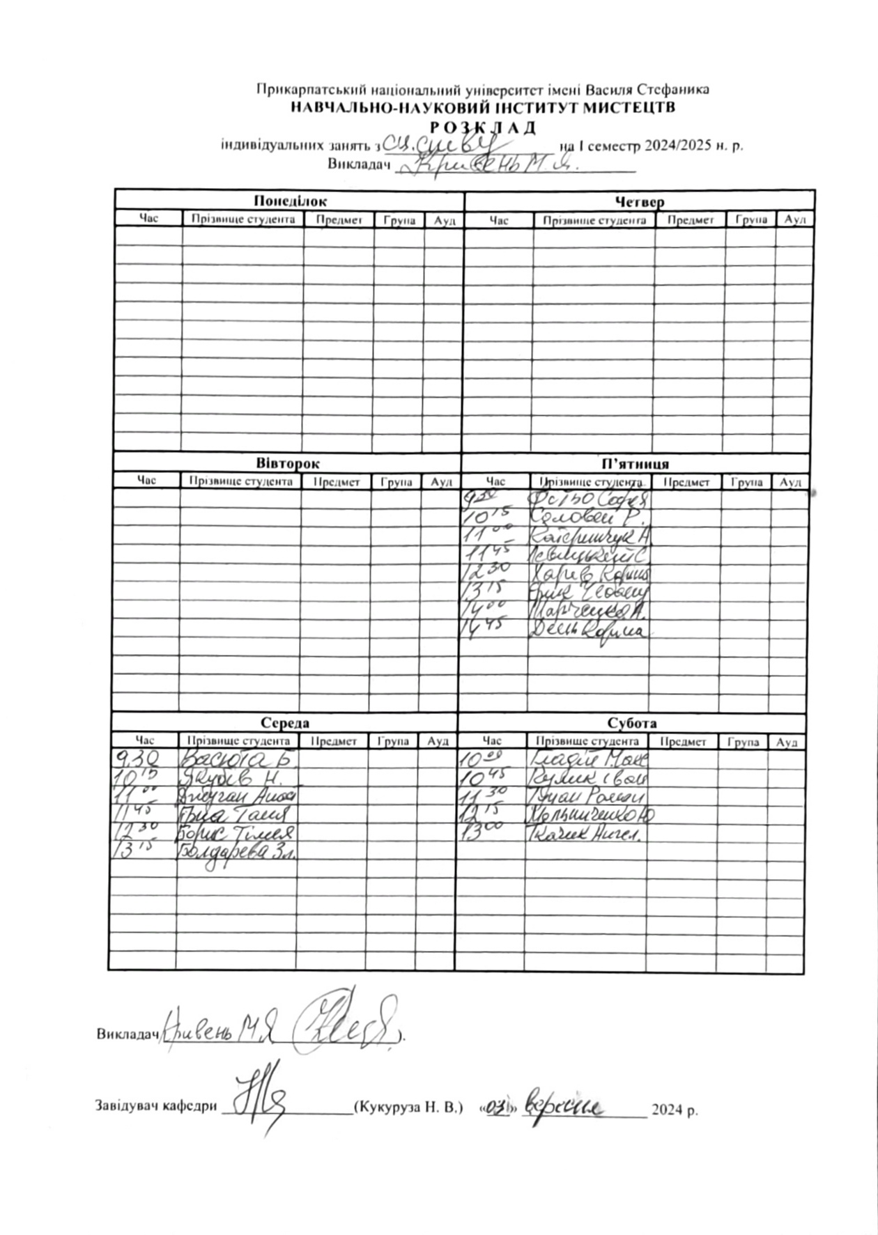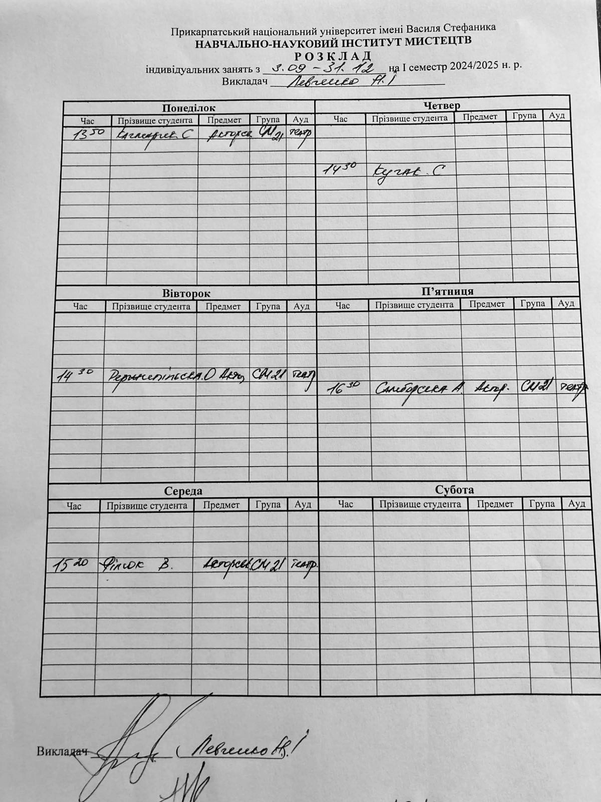 Розклади індивідуальних занять І семестр 2025-2026 навчального року ІІ семестр 2024-2025 навчального року І семестр 2024-2025 навчального року ІІ семестр 2023-2024 навчального року