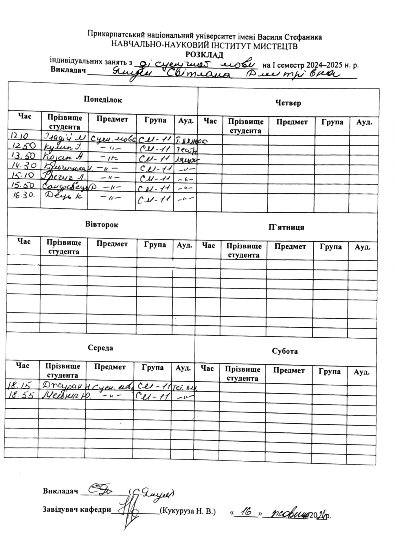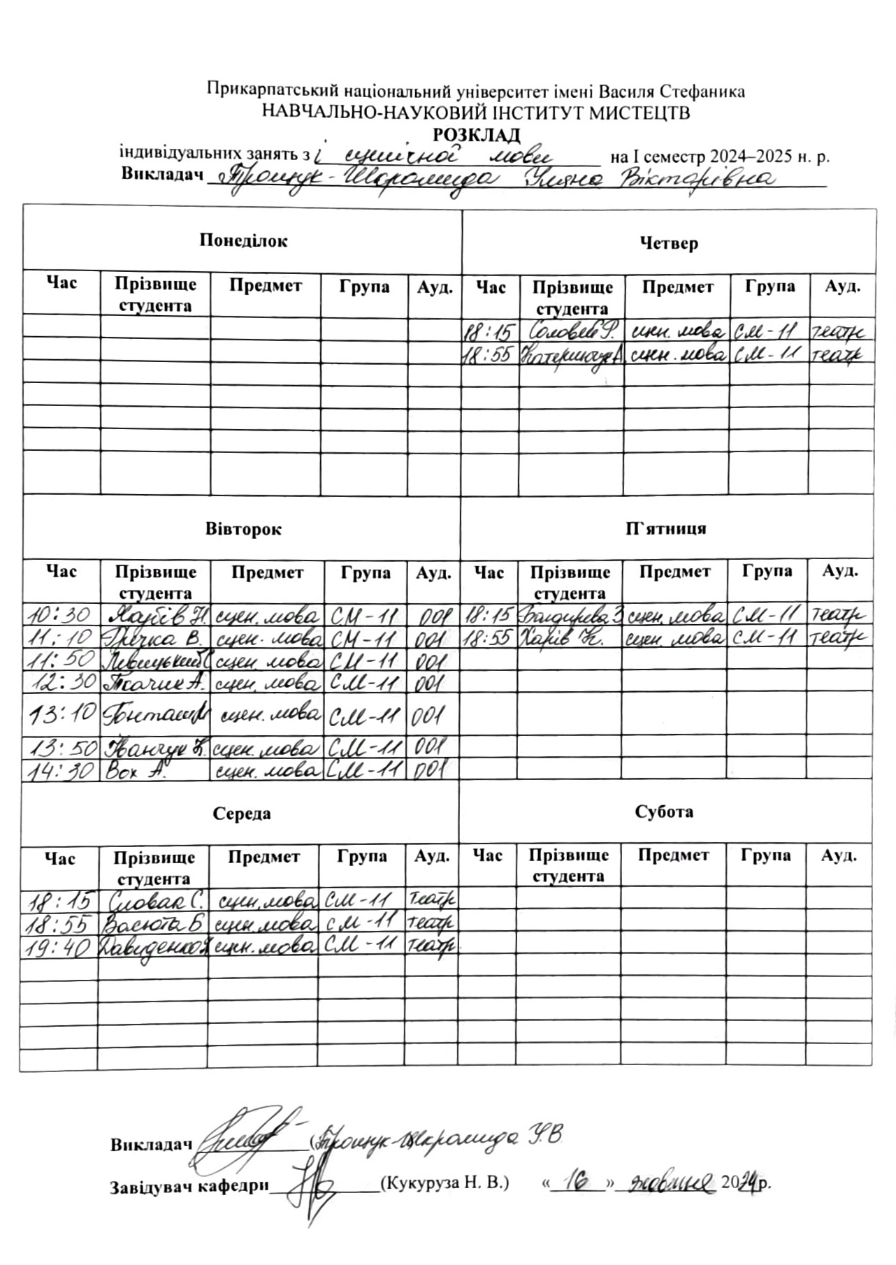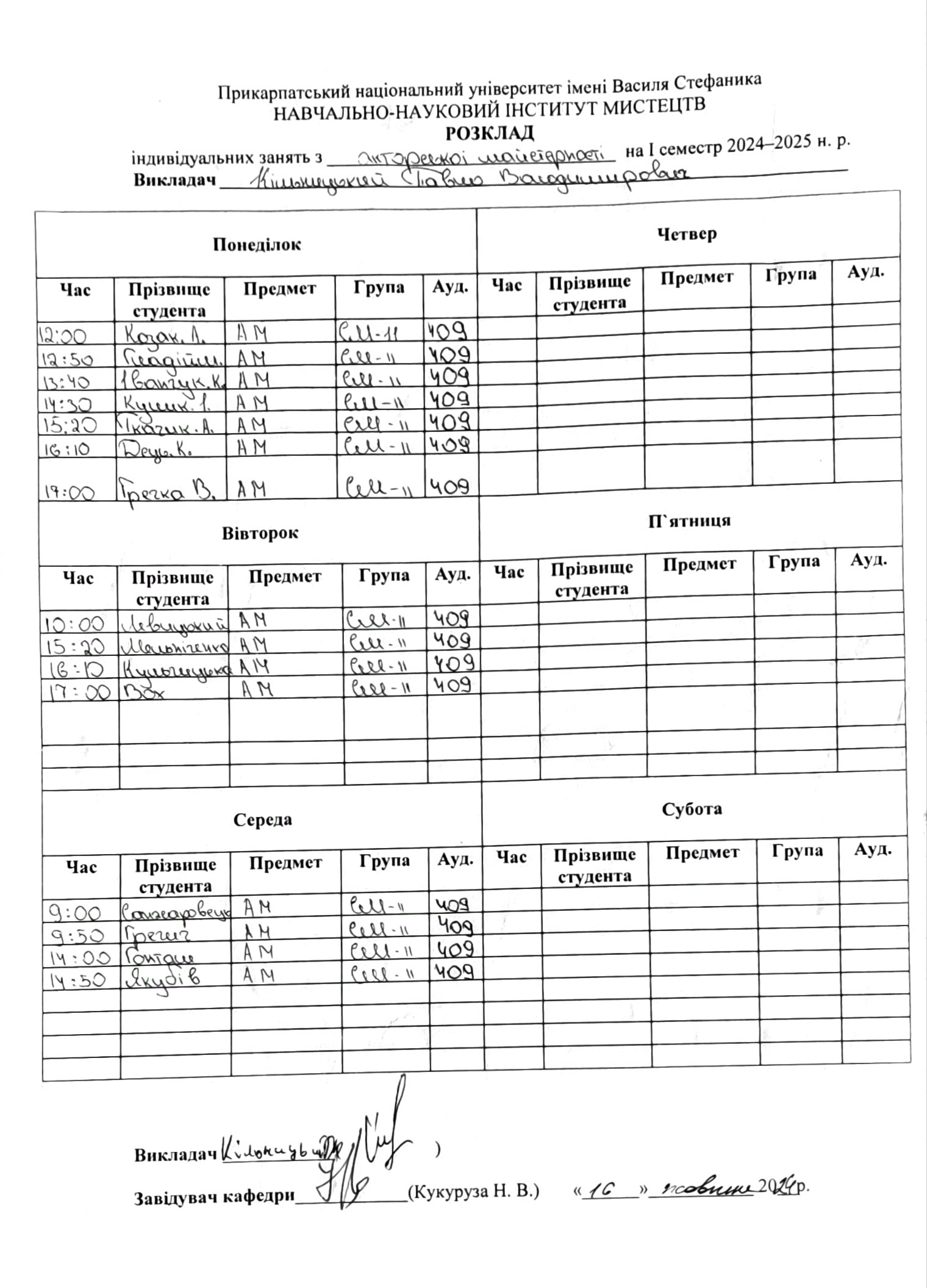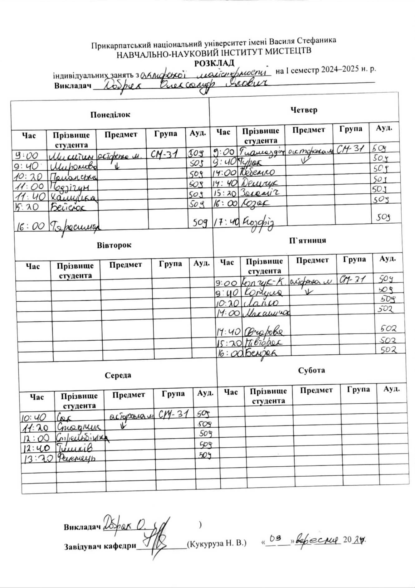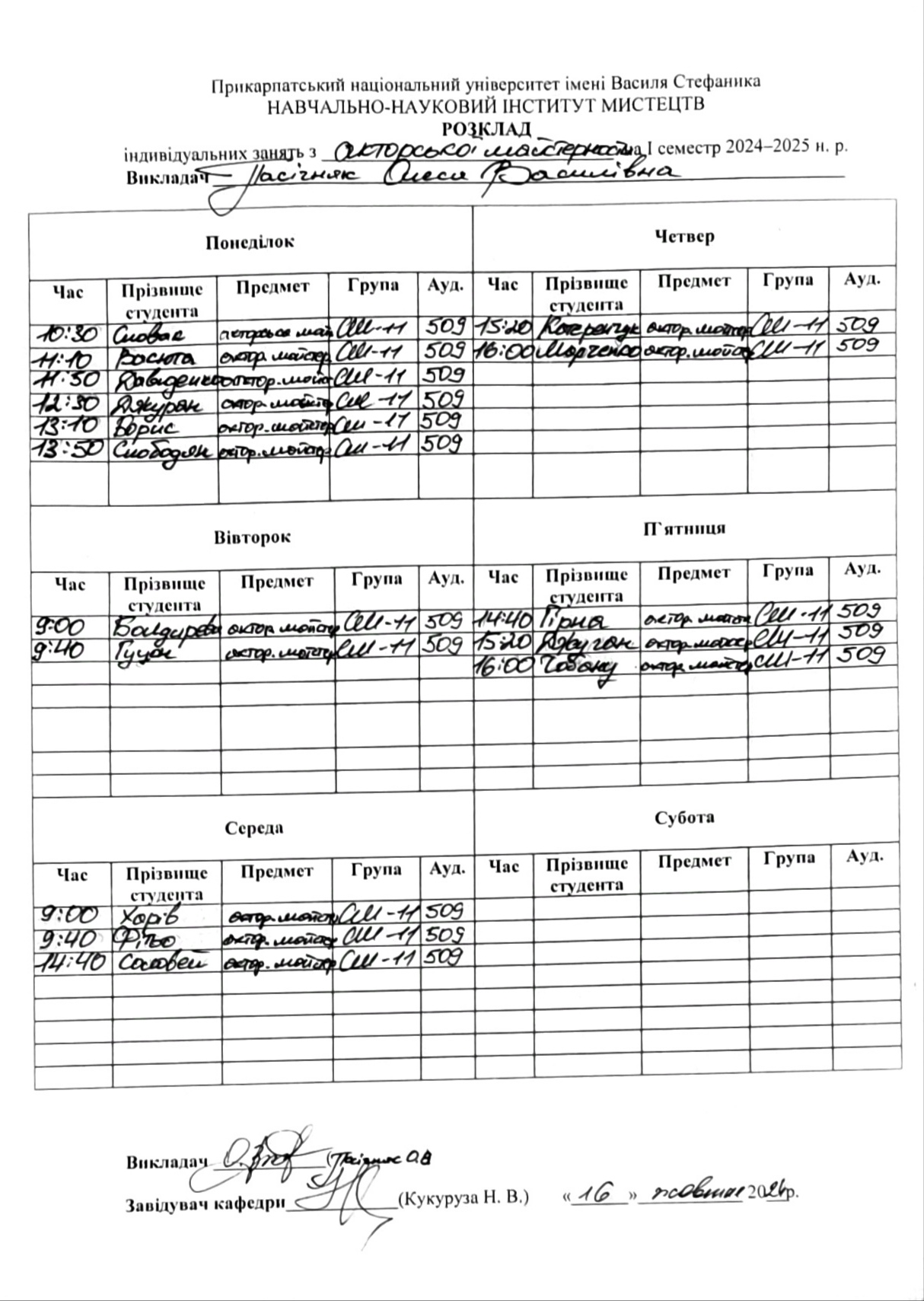 Розклади індивідуальних занять І семестр 2025-2026 навчального року ІІ семестр 2024-2025 навчального року І семестр 2024-2025 навчального року ІІ семестр 2023-2024 навчального року