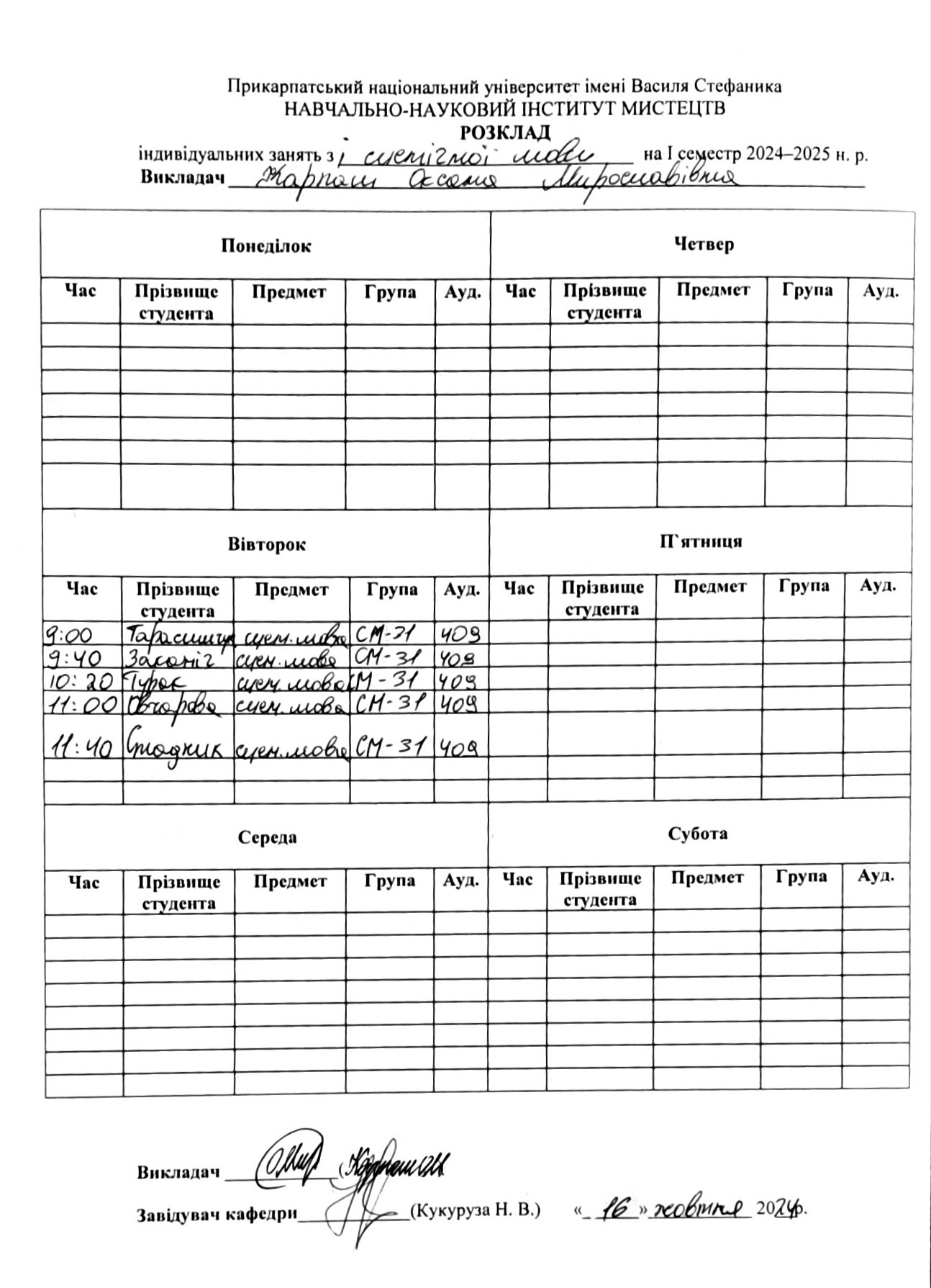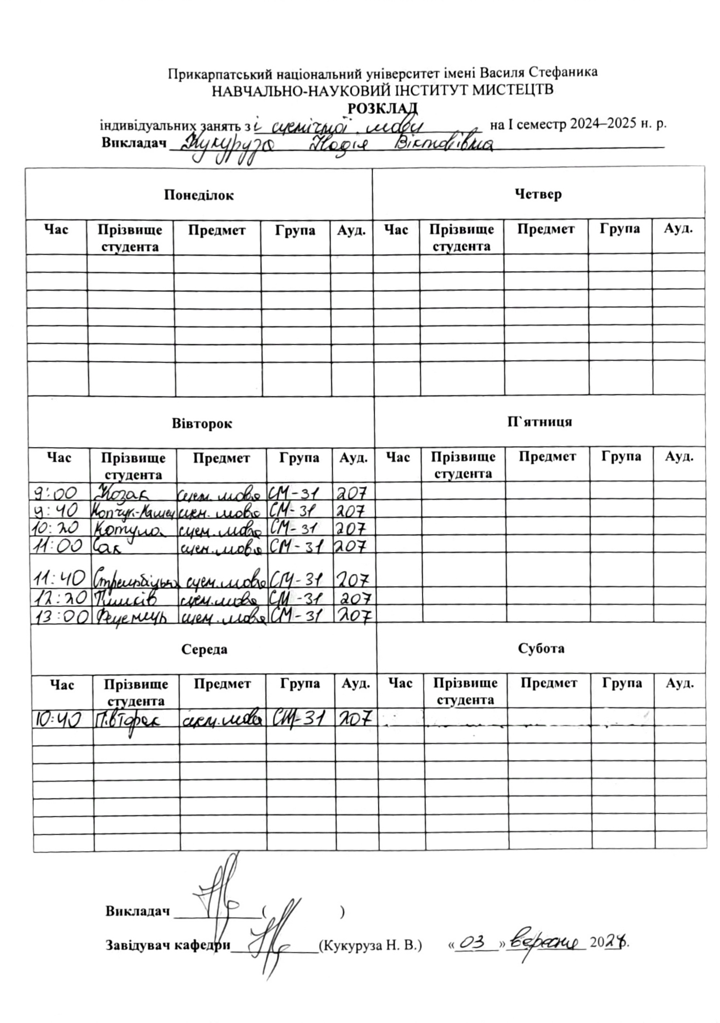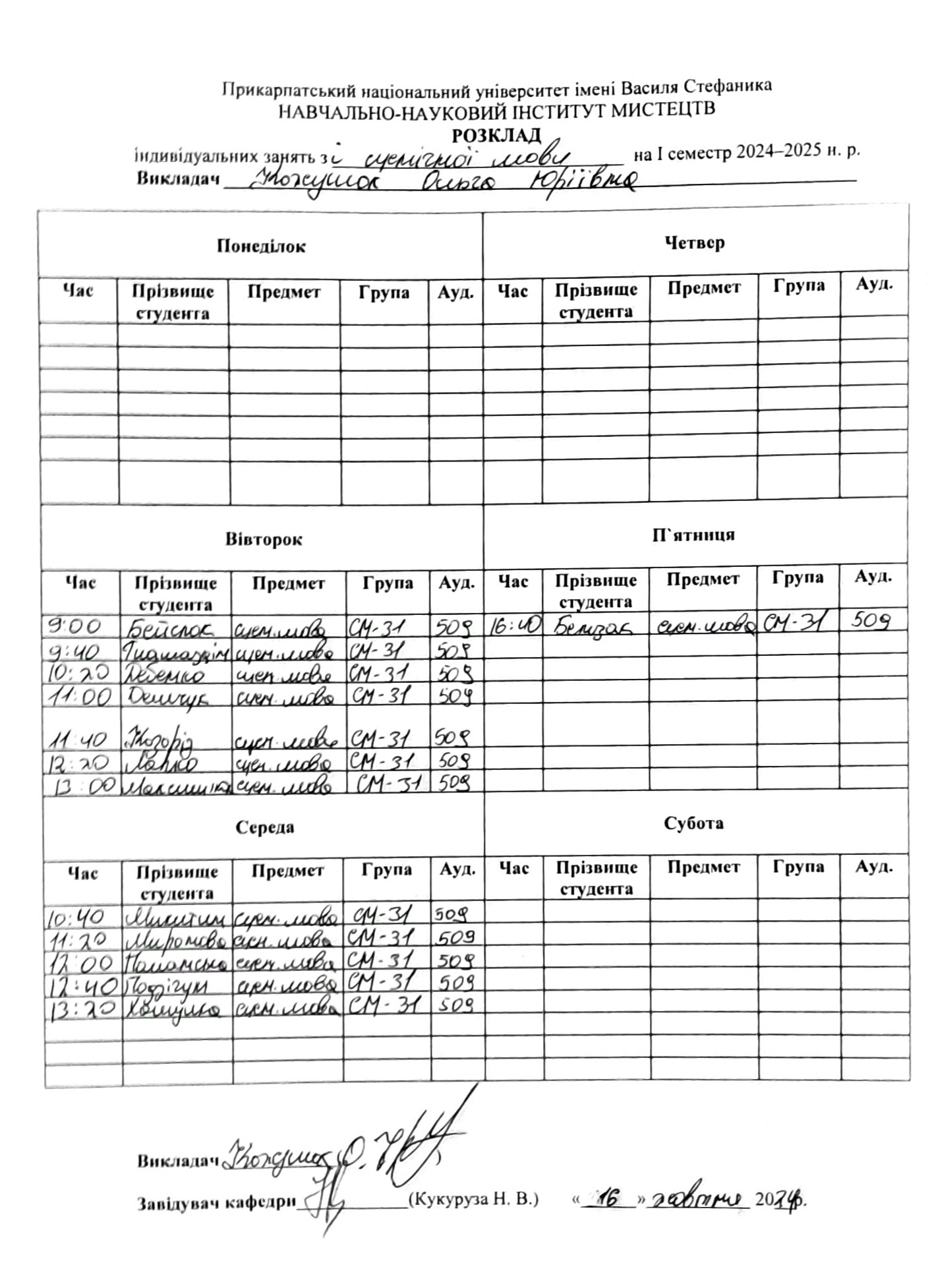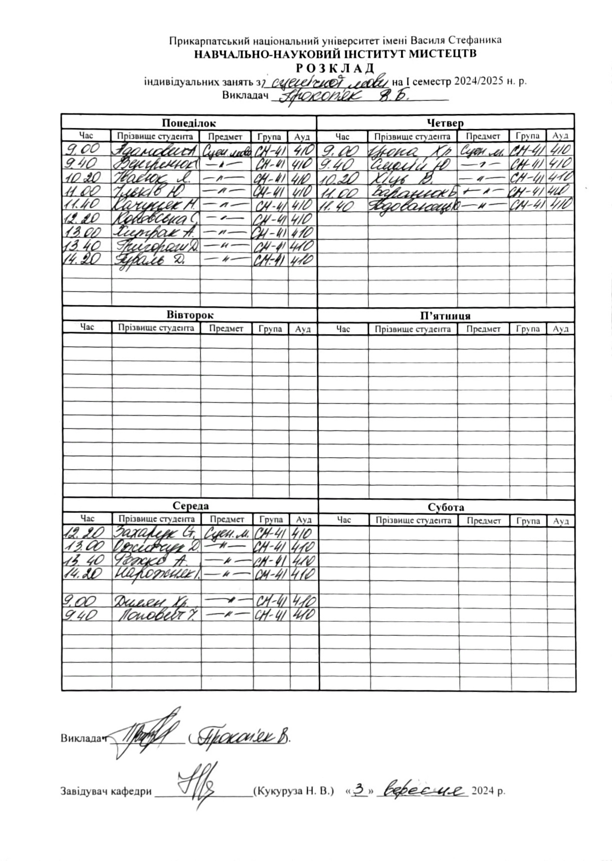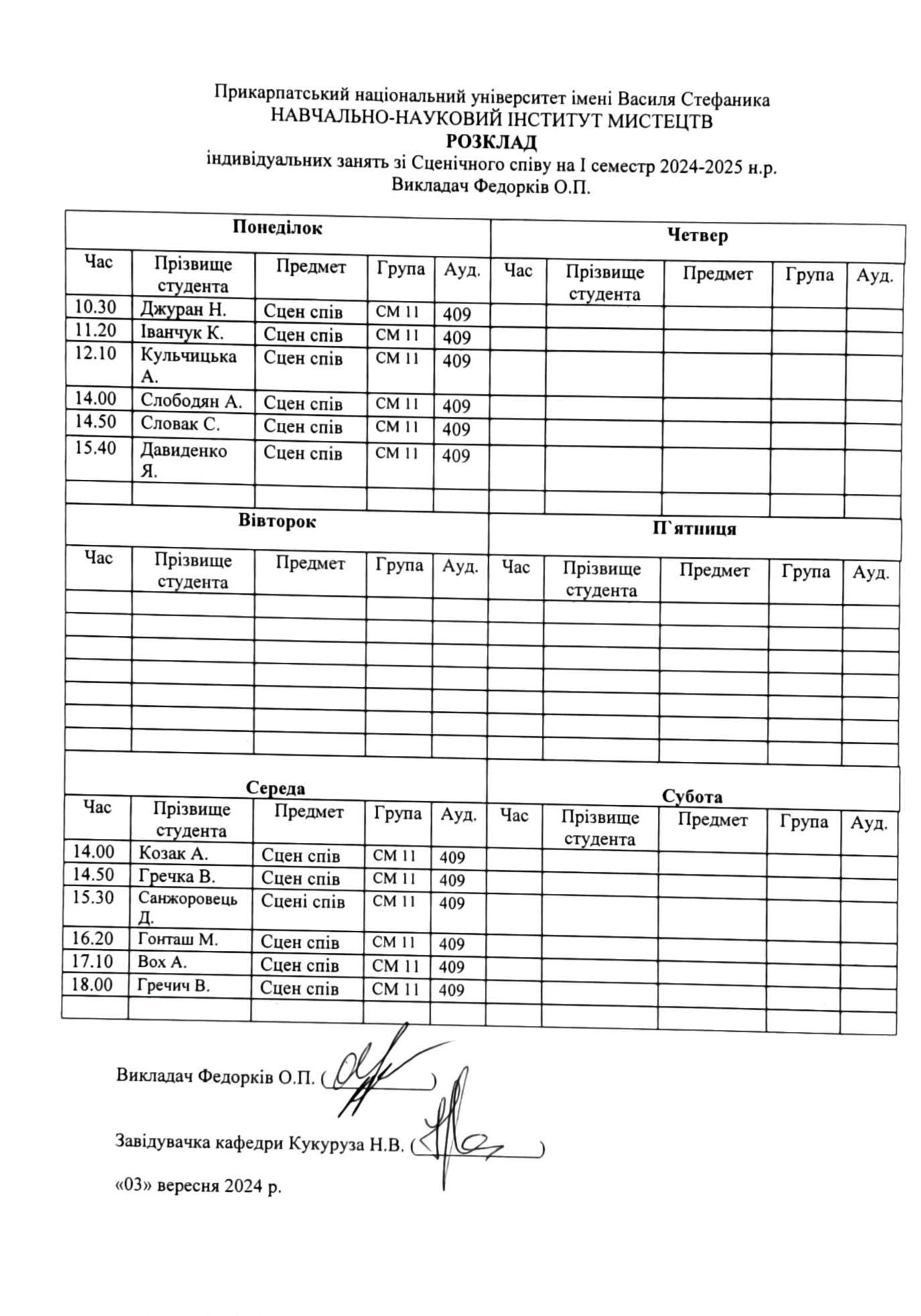 Розклади індивідуальних занять І семестр 2025-2026 навчального року ІІ семестр 2024-2025 навчального року І семестр 2024-2025 навчального року ІІ семестр 2023-2024 навчального року